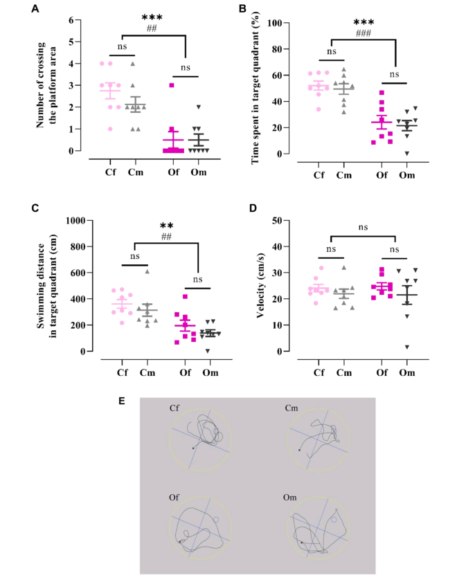 记忆能力下降:在记忆测试中,肥胖对记忆的影响是显著的。肥胖组大鼠到达平台位置的次数减少(图2A)。此外,肥胖大鼠在平台所在的目标象限花费的时间较少(图2B)。而且,肥胖大鼠在目标象限的行进距离显著减少(图2C)。图2(D)为大鼠的游泳速度,图2(E)为大鼠游泳行为的示范表现。