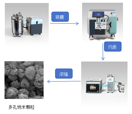 研磨-均质-浓缩法较为简单,全程无毒害试剂,较为安全,制备的多孔纳米颗粒得率高、均一性好、颗粒尺寸均匀等优点,而且可以在温和的条件以及低温条件下进行,适用于许多对温度和化学环境敏感的材料。